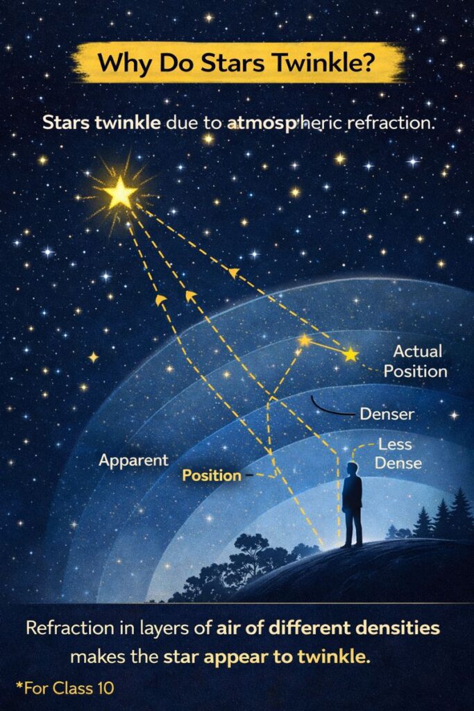 - Stars twinkle due to atmospheric refraction.