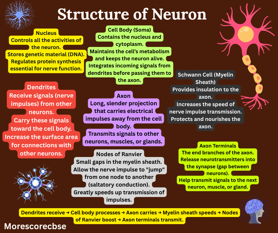 Cell Body (Cyton / Soma)– Central swollen part of neuron.- Contains nucleus, cytoplasm, mitochondria, Nissl bodies (granules for protein synthesis).– Controls all metabolic activities of neuron.- Integrates incoming signals from dendrites.- Maintains the life of the cell.